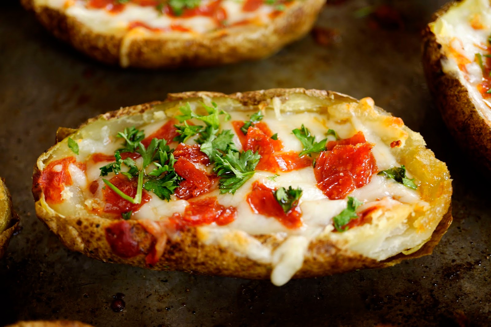 Preheat oven to 425. Coat a baking sheet with cooking spray. Slice top half or two thirds of potato flesh off each potato wedge. Spoon about 2 tsp of pizza sauce over each potato wedge; sprinkle wedges with pepperoni and then with cheese. Carefully place potato skins on prepared baking sheet. Bake until cheese melts and potatoes are hot, about 6-8 minutes. Season to taste with oregano, red pepper flakes or garlic.